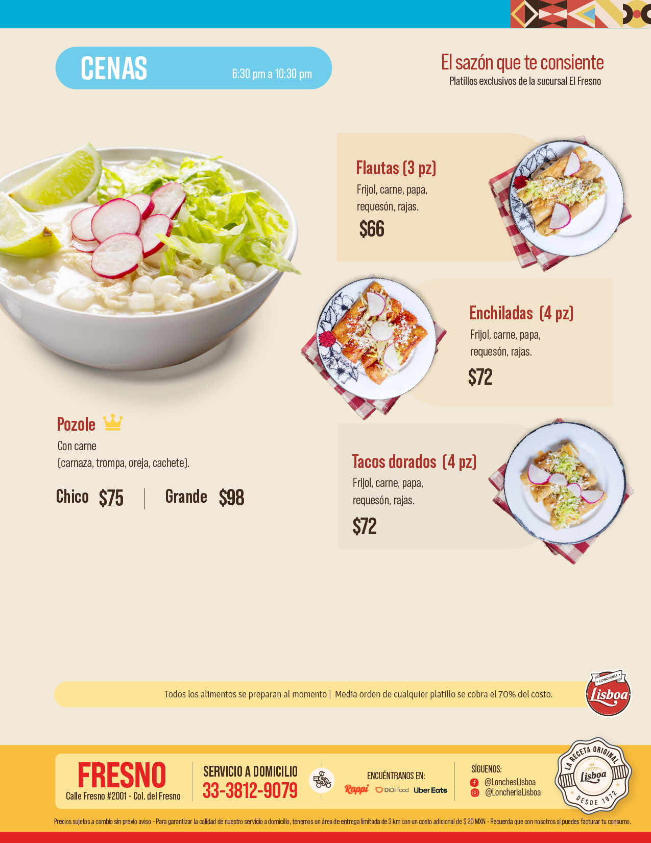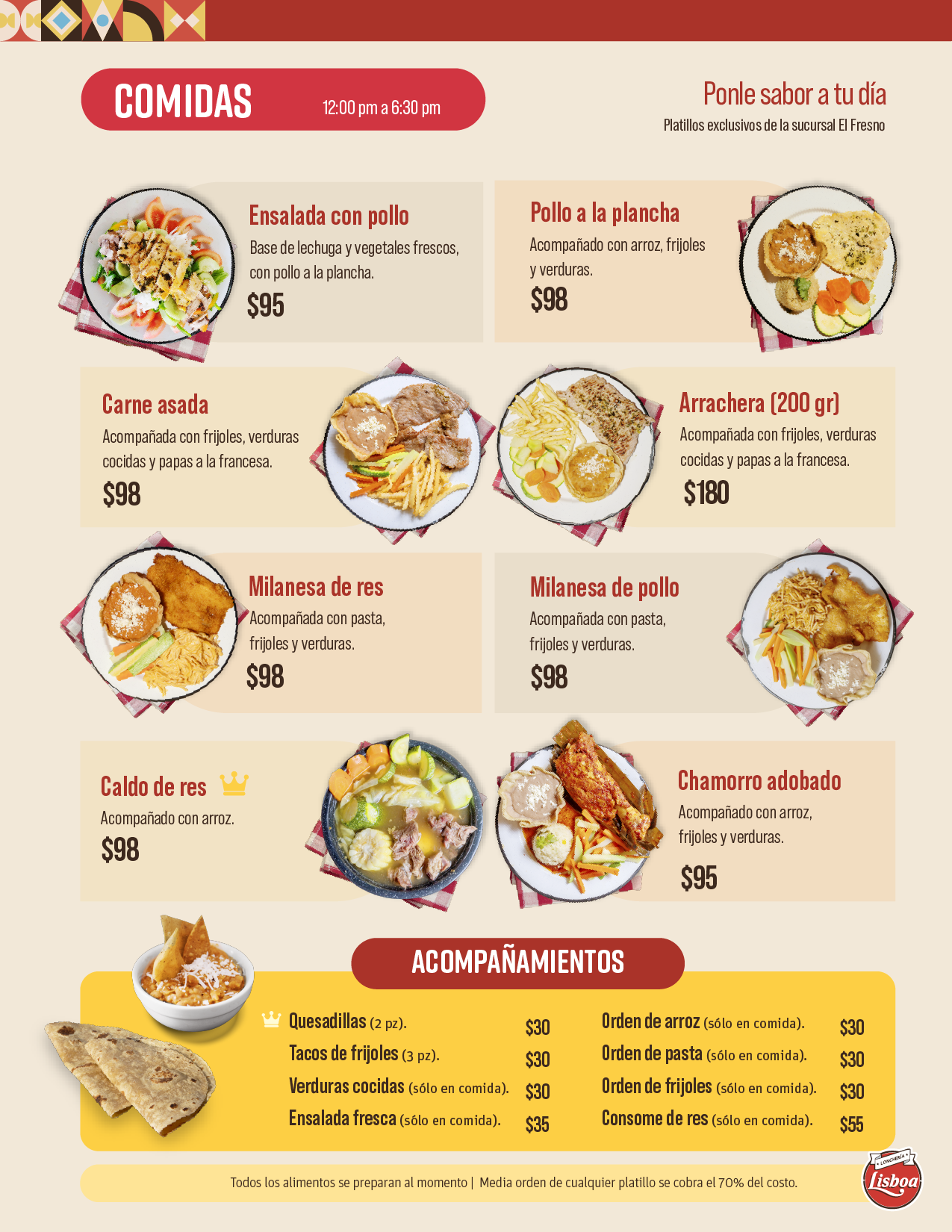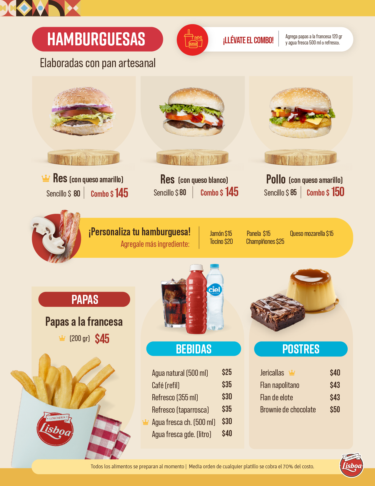 © Lonchería Lisboa. 2024. Todos los Derechos Reservados. El contenido, imágenes y logotipos mostrados en este documento son propiedad de Lonchería Lisboa y están protegidas por las leyes de derechos de autor y propiedad industrial. Se prohíbe su copia, reproducción o distribución total o parcial por cualquier medio sin el consentimiento por escrito de Lonchería Lisboa.